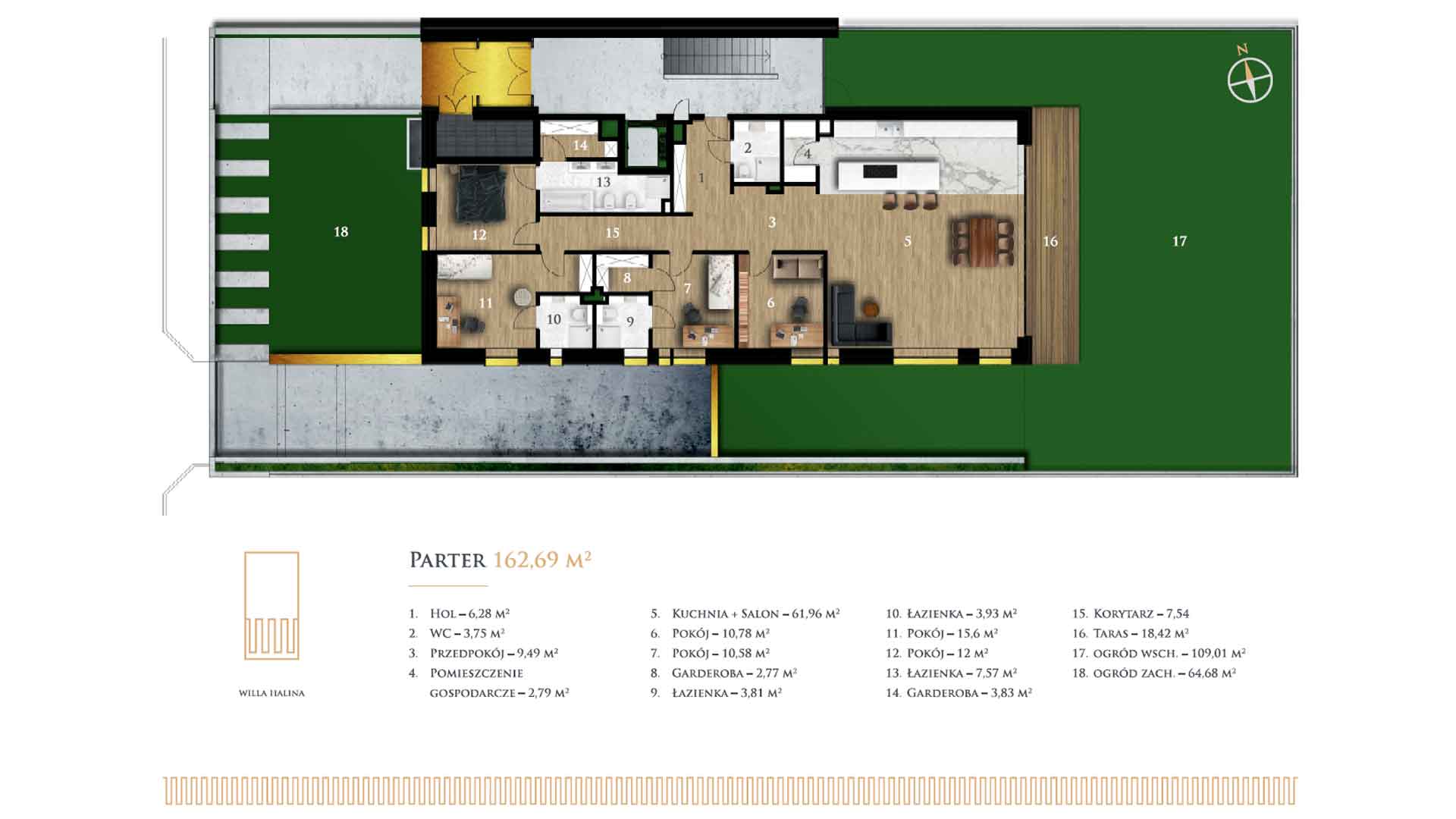 Nowoczesna, unikalna, a zarazem ponadczasowa architektura wkomponowana została w istniejące otoczenie willowej części Mokotowa. W nawiązaniu do otaczającej zabudowy, powstał w pełni funkcjonalny 3-kondygnacyjny budynek mieszkalny, który wraz z zielonymi ogródkami i małą architekturą tworzy jedną harmonijną całość. Jednocześnie Willa Halina charakteryzuje się niezwykłą prostotą i spójnością formy. Elewacja została podzielona na trzy bryły dzięki zastosowaniu stopu szlachetnych metali o delikatnym złotym połysku oraz panoramicznych okien. Duże wejście do budynku wykonane z aluminium w elegancki sposób odcina willę od sąsiadującej zabudowy. Naświetlony hall wraz drewnianymi schodami, przeszklony i zwieńczony dużym świetlikiem, akcentuje szlachetność obiektu. Hydrauliczna, bezszumowa winda zapewnia komfort komunikacji pomiędzy kondygnacjami. Tylko 3 apartamenty, każdy zajmujący jedną kondygnację, podkreślają kameralność obiektu. Jednocześnie duży garaż z 6 szerokimi miejscami parkingowymi wraz ze znajdującymi się w nim dużymi komórkami lokatorskimi zapewnia niezbędny komfort mieszkańcom. W garażu znajdują się także pomieszczenia techniczne wraz z nowoczesną, oszczędną kotłownią.